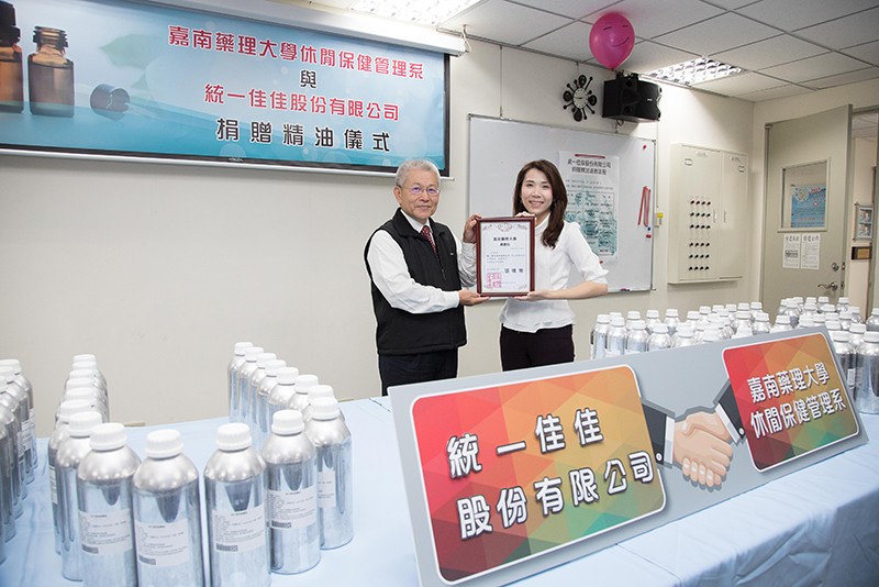 統一佳佳公司鄭玉玲經理本身為嘉藥畢業校友,本著回饋母校心意,捐贈精油嘉惠學弟妹。鄭經理說,公司相當認同休閒系的辦學理念,對於系聘請業師到校授課,以強化芳香保健人才培養訓練也非常支持,因此特捐贈「勻體舒壓按摩油」、「男性生理按摩油」及「女性生理按摩油」三類共16萬毫升的按摩精油,提供系上芳療保健課程與輔導考照等教學研究之用。