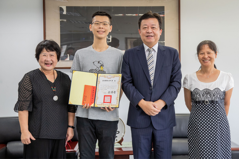 嘉藥藥學系葉鴻同學開心與校長(右二)與院長(左一)及系主任合影