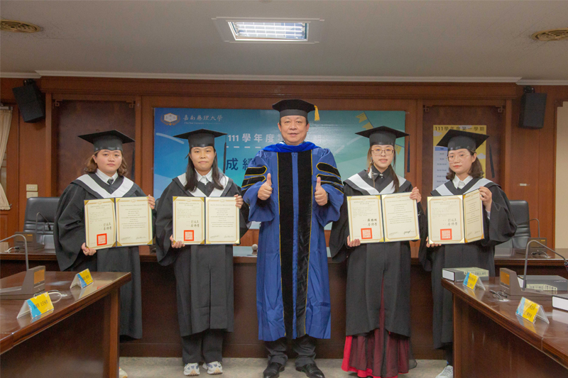迎春添喜事!嘉南藥理大學兔年開春好兆頭,於2月6日為該校職安系趙珮岑與陳惠禎、消防學程張佳芳以及資管系林芃岑四位成績優異提早完成修業的同學,舉辦了一場簡單又溫馨隆重的畢業典禮,由校長李孫榮親自分別為學生撥穗並頒發學士畢業證書,多位師長也一同參與慶賀,獻上滿滿的祝福。